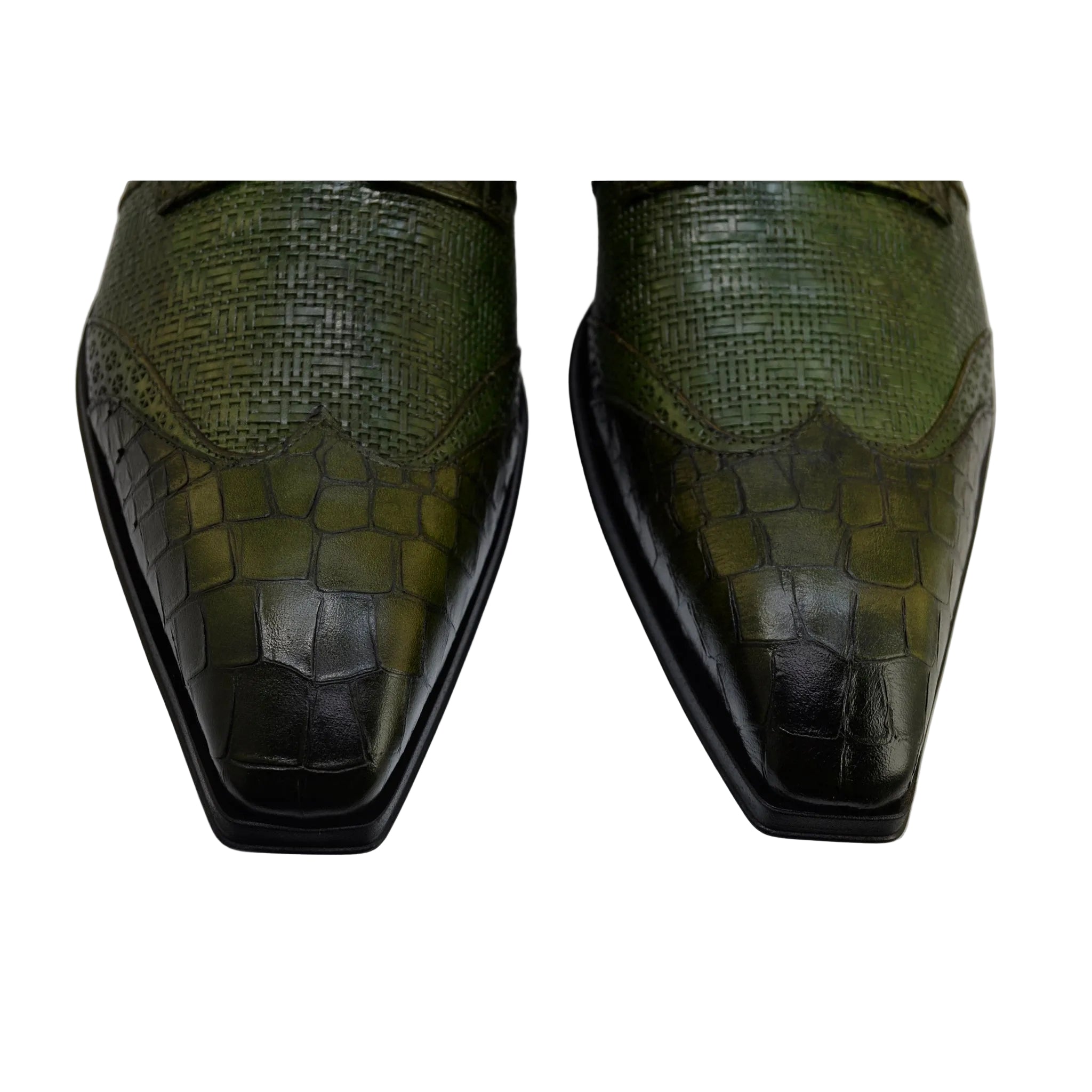 The Jo Ghost Model 5393 dress shoes showcase distinctive Italian design with a luxurious mix of textures and refined detailing. Crafted in a rich green colour with a hint of black, this slip-on style combines printed crocodile leather with mesh leather for a bold, fashion-forward look.