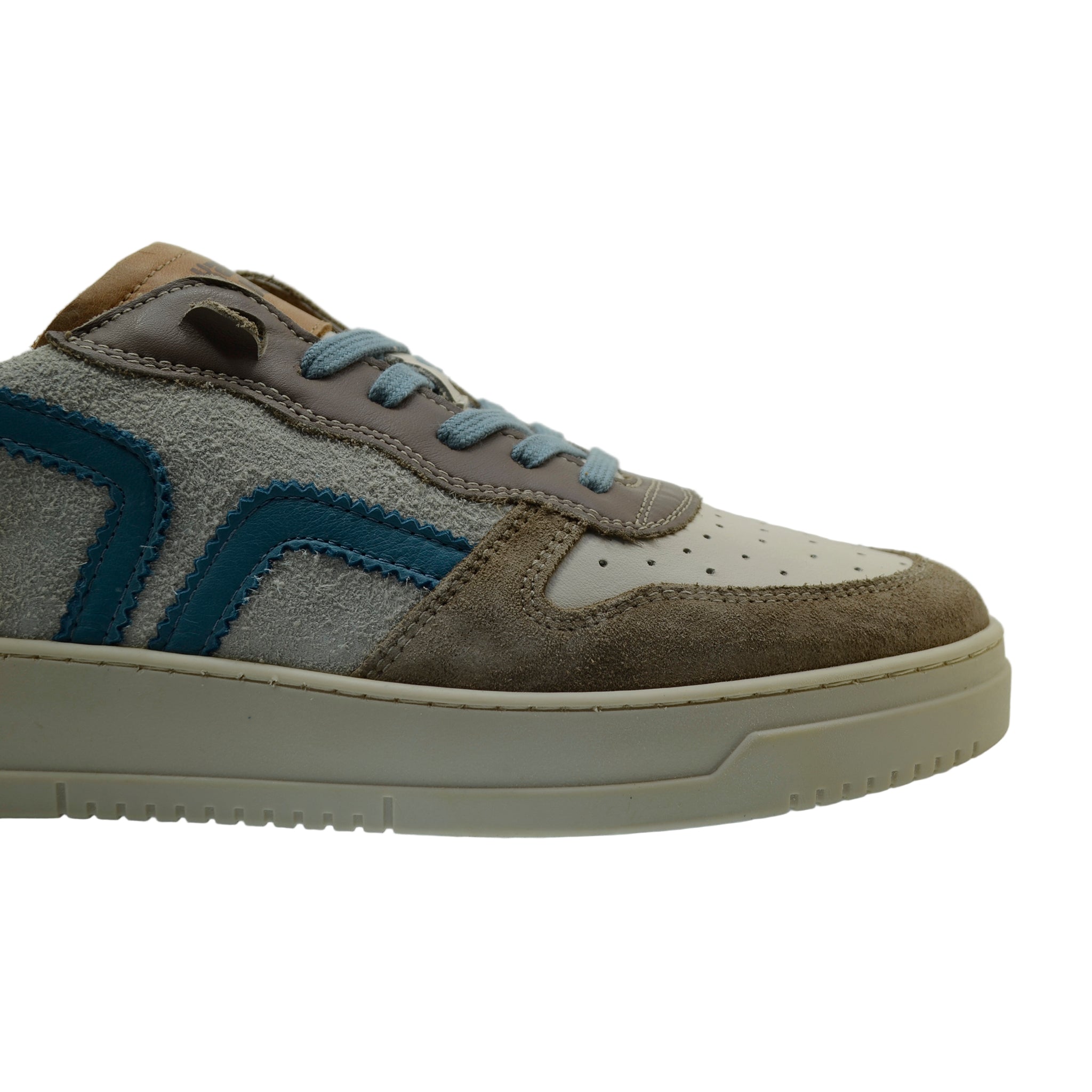 Handmade in Italy, the Kamo-Gutsu Campo-048 “Topo Combi” sneaker blends vintage sport styling with modern comfort. The upper features a refined mix of taupe suede, blue leather, and cream leather panels, complemented by soft blue laces and a taupe leather heel panel. The layered textures and natural tones create a versatile and contemporary look. A lightweight cream rubber sole ensures durability and comfort for everyday wear.